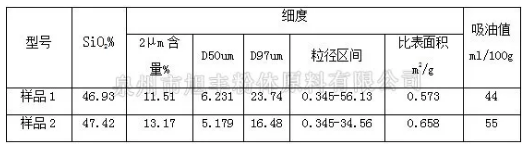 挑選樣品1和樣品2兩款相同礦石,不同細度的滑石產品,進行檢測對比,由下表的檢測數據可知:滑石粉的粒徑越細,比表面積越大,粒徑分布區間越窄,吸油值越高。