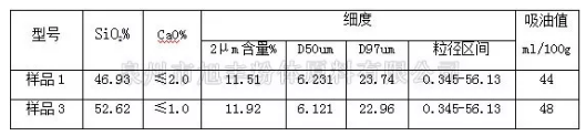滑石粉中的二氧化硅(SiO2)含量也是影響其吸油值的主要因素之一,選取樣品1和樣品3兩款相同細度,不同硅含量的滑石產品,進行檢測對比,由下表的檢測數據可知:原礦二氧化硅含量越高,碳酸鈣等雜質含量越低,吸油值越高。
